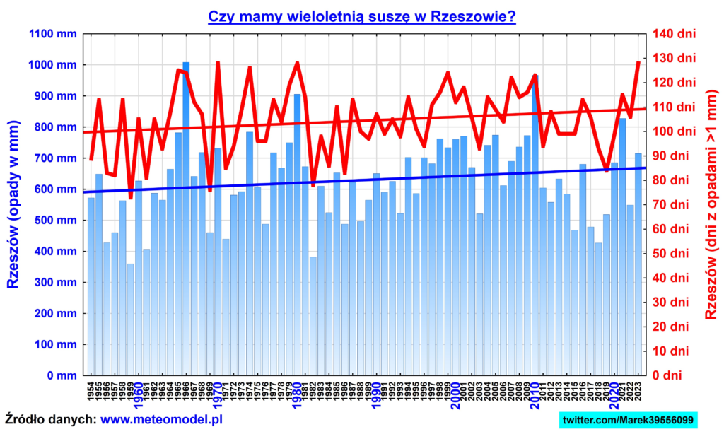 Na powyższym wykresie widać na przykładzie Rzeszowa, że nie ma mowy ani mniejszej sumarycznej ilości opadów, ani mniejszej ilości deszczowych dni. Dane dla pozostałych obszarów kraju są podobne. Informacje o postępującej suszy to są medialne brednie, powtarzane bezkrytycznie przez mainstreamowe media i mają Was przekonać do poparcia idiotycznych i bardzo kosztownych rozwiązań „ekologicznych”.